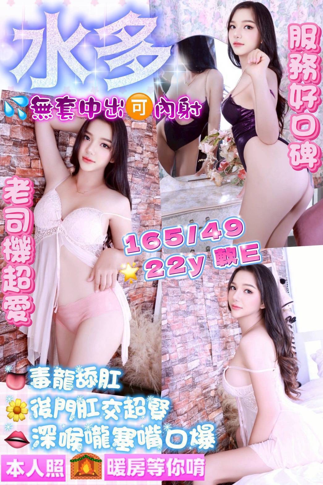 無套吹/親嘴/舌吻/品鮑/69/奶炮/胸推/屁推/按摩/舔蛋蛋/懶人澡/水中蕭/情趣用品/絲襪/角色扮演