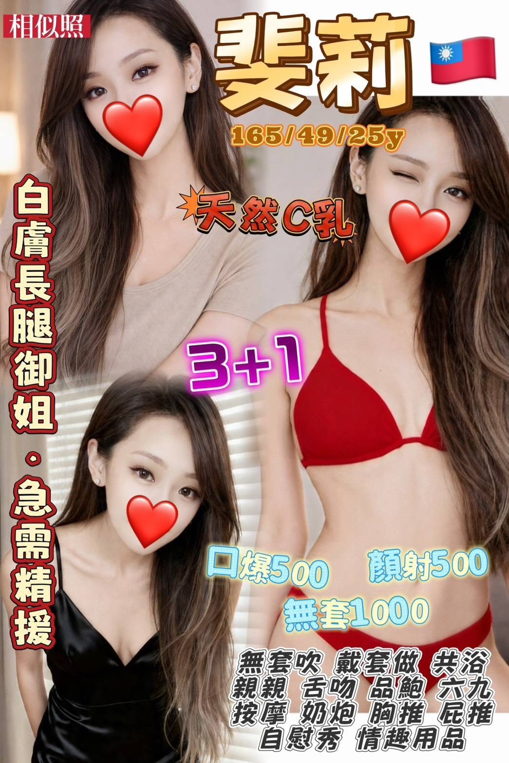 無套吹 戴套做 共浴 親親 舌吻 69 按摩 奶炮 舔蛋 胸推 屁推 絲襪 艷舞 自慰秀 情趣用品